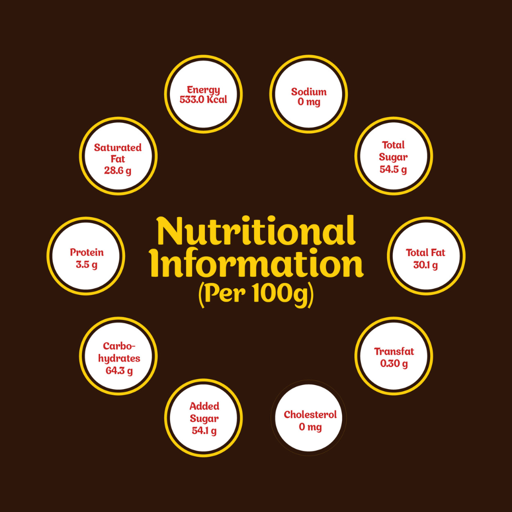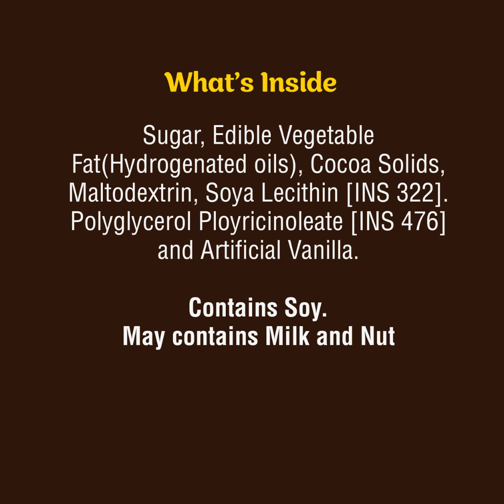 Sugar, Edible Vegetable Fat (Hydrogenated Oils), Cocoa Solids, Maltodextrin, Emulsifiers-Soya Lecithin [INS-322], Poly Glycerol Poly Ricinoleate [INS 476], and Added Flavor- Artificial Vanilla